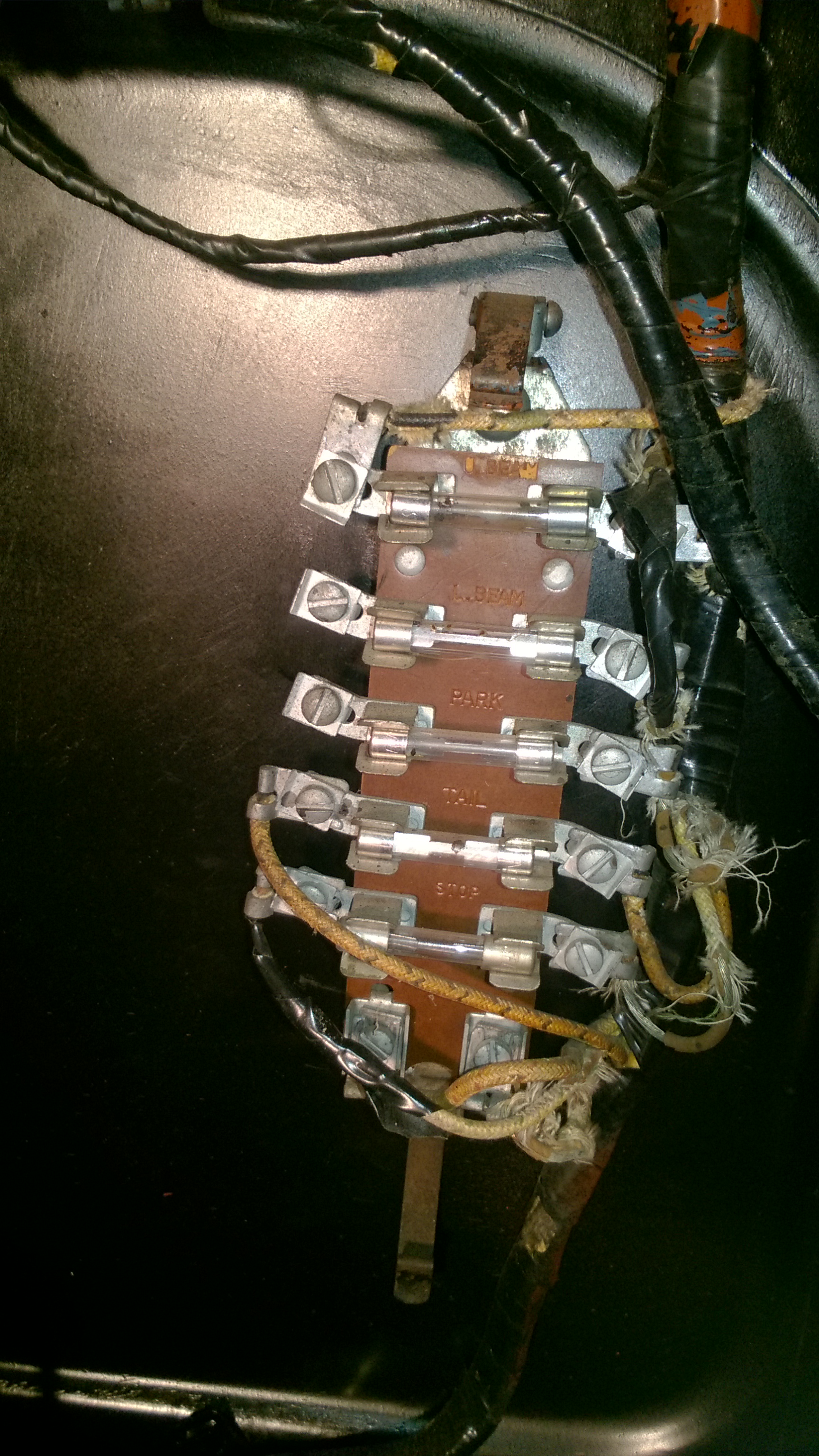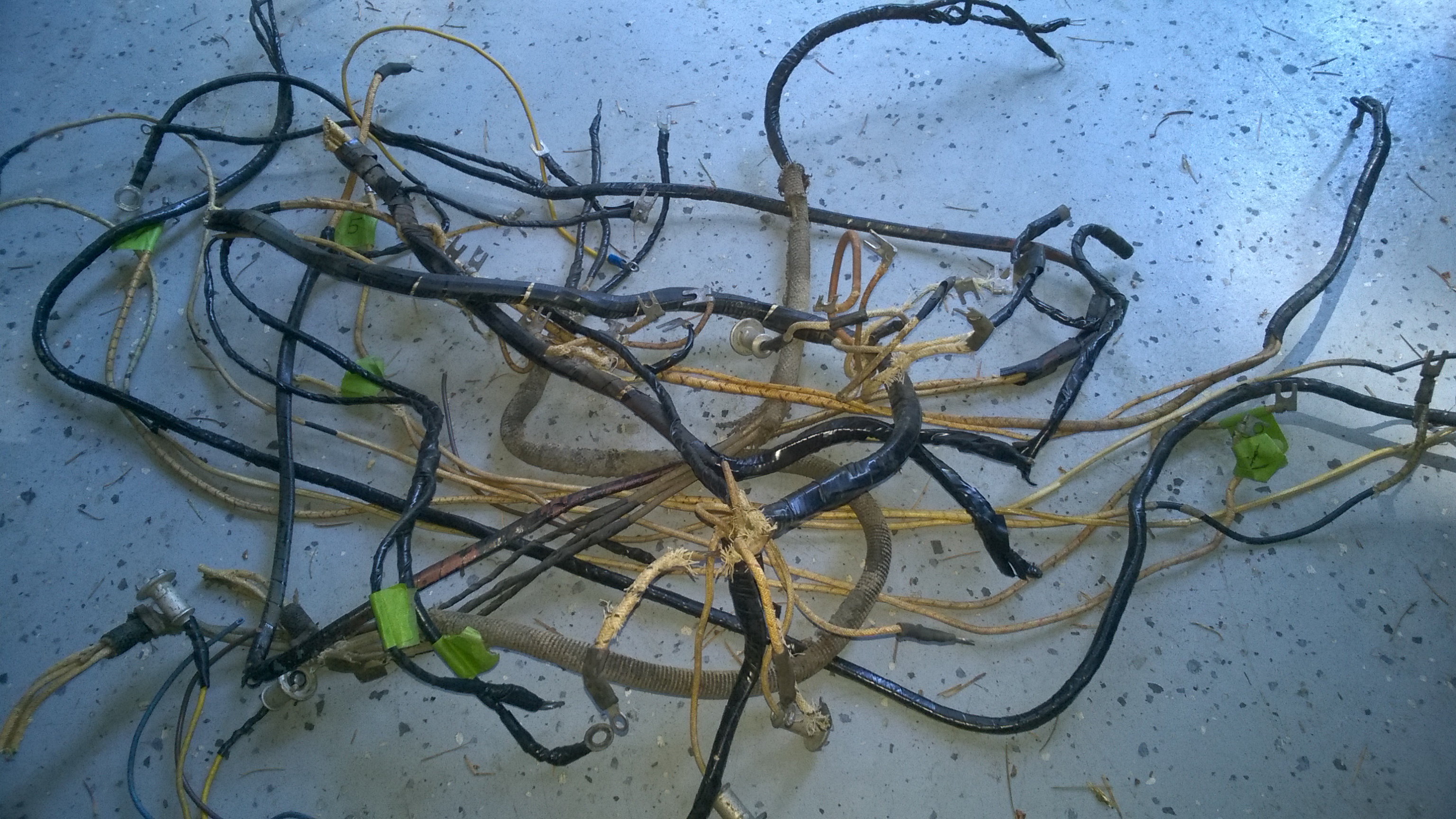In my quest to make incremental improvements, it came time to upgrade the wiring. Frankly, I never realized how dangerous the old wiring was until I started removing it. As you can see, many of the wires had been wrapped in electrical tape after the original cloth insulation hardened, cracked, and fell off. There were a few wires completely bare, the worst area probably being immediately behind the headlight buckets – out of view.