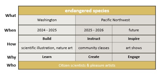 Therefore, in collaboration with environmentalists, citizen scientists, and art enthusiasts of all abilities, we will shift our attention to raise awareness of Washington’s native and endangered species (as published by Washington Department of Fish and Wildlife).