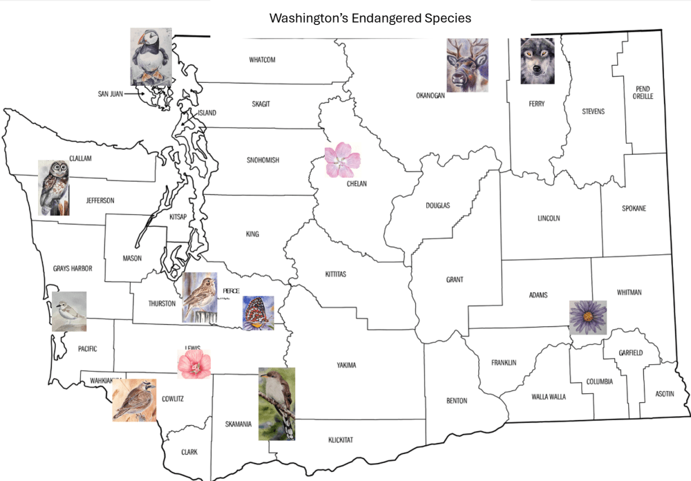 Next, in collaboration with an environmentalist, we researched and published articles describing twelve endangered species that call (or have called) Washington home. Through this work, we learned that: