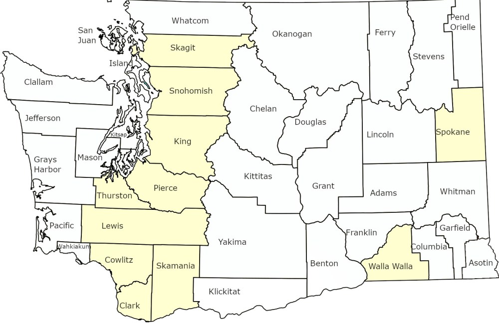 Counties: Pacific, Wahkiakum, San Juan, Island, Kitsap, the Pacific coastlines of Clallam, Jefferson, Grays Harbor, and the Puget Sound coastlines of Whatcom, Skagit, Snohomish, King, Pierce, Mason, Thurston.