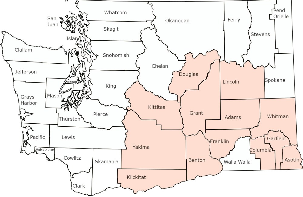 Counties: Douglas, Kittitas, Yakima, Klickitat, Grant, Benton, Lincoln, Adams, Franklin, Whitman, Garfield, Columbia, Asotin.