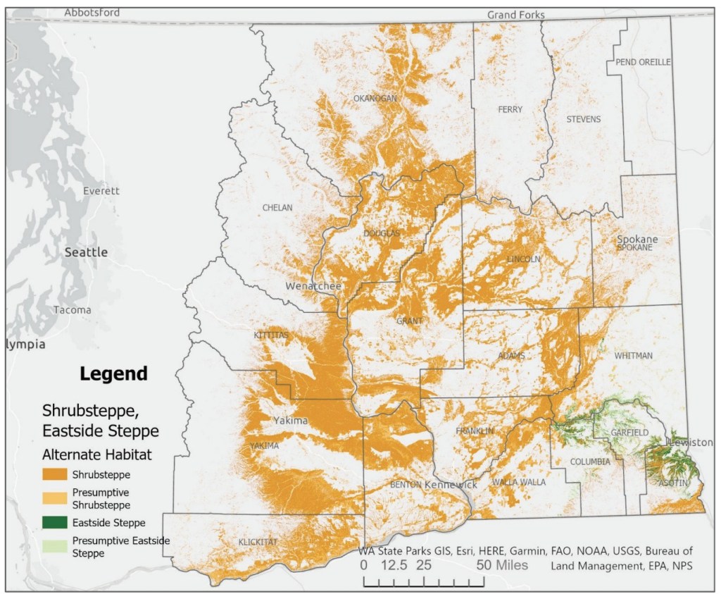 Washington Department of Fish and Wildlife (WDFW). (2022). PHS Shrubsteppe and Eastside Steppe Map. Retrieved March 20, 2025, from https://wdfw.wa.gov/sites/default/files/2023-05/shrubsteppe-tech-report.pdf