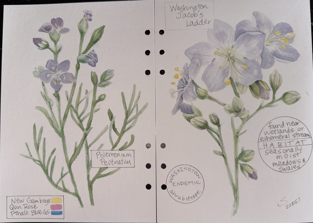 The Washington Jacob’s ladder is brought into focus through both historical botanical illustration and contemporary field observation. It features Polemonium pectinatum Greene—Washington polemonium—shown in Fig. 3888 from An Illustrated Flora of the Pacific States (Abrams & Ferris, 1951), which captures the species with precise scientific clarity. This is paired with a 2025 field sketch by Smith, created in watercolor and pencil, reflecting direct observation in habitat. Together, the two works highlight a dialogue between classic botanical documentation and modern nature journaling, emphasizing both accuracy and lived experience in understanding this Washington-endemic plant.
